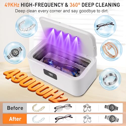 Click for More Images ?Powerful & Efficient Cleaning?: Our jewelry cleaner operates at 48KHz, ensuring a thorough 360° clean. It effectively removes grease and dirt from jewelry, rings, necklaces, glasses, dentures, watches, coins, and more...