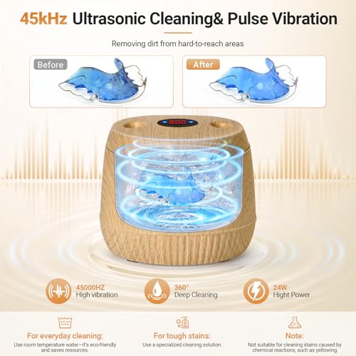 45kHz Ultrasonic Deep Cleaning:This ultrasonic cleaner uses advanced 45kHz ultrasonic waves to deeply clean dental retainers, orthodontic aligner,mouth guard,dentures and other dental appliances. It effectively removes dirt, and debris from hard-to-reach areas. For tough stains, add a compatible cleaning solution to enhance performance. Note: It is not suitable for stains caused by chemical changes, such as yellowing or tarnishing on silverware