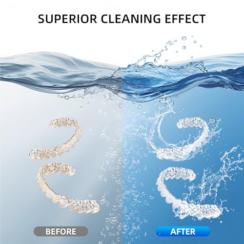 [48kHz Ultrasonic Cleaning] The retainer cleaner machine operates at 48kHz, delivering 360° cleaning action that helps loosen and remove built-up residue from retainers, dentures, mouth guards, night guards, aligners, jewelry, and more—helping restore a clean appearance without harsh scrubbing